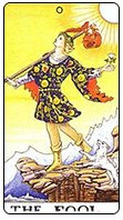 这张牌画一个旅行者站在悬崖边缘,双眼凝视天空,脚畔有一条狗吠叫着,左手上有一朵白玫瑰,跨在右肩的棍子上吊着一个袋子,里头装着他的行李。阳光灿烂明亮,映射在附近白雪盖顶的山头。他是一个活在当下的人,正经历着“现在”的力量。他手中的白玫瑰正代表天真无知。他就快要从崖旁踩空掉下去了,而他似乎相信,生命将会支持他的。