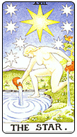 这张牌上面的女人提着两个水壶。她将其中一壶里的水倒进水池中,而另一壶则倒在陆地上。天空很晴朗,有八颗星星,每一颗星星都有八个角,清晰可见。有一只展翅欲飞的朱鹭坐在一棵树上,这朱鹭是透特(Thoth)的象形符号或象征,透特是古埃及的时间守护神,也是“阿卡沙秘录”(Akashicreconrds)的监护者,那是为众神和医疗者的守护神而抄写的纪录。
