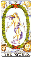 她轻轻地握着她的权杖,因为她了解是意图带来你想要的结束,而非仪式。在牌四个角落的四种动物(包括人这种动物),现在都有了完整色彩,因为她注意到这四种元素以及让这四种元素和谐共处的需要。这四种元素都有一种精神的基础,因为它们都出现在云当中,相同的云或精神也出现在权杖、圣杯、宝剑和五角星的王牌中。就这样,小阿尔克纳牌的课题被回想起来,付诸实现。围绕着她的花园象征着成功,而且是一个行进中的成功,因为花圈既没有起始也没有终点。
