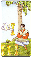 牌上所画的这个人无法从三个杯子中得到满足,或无法满足于他眼前的机会,不过只要他准备好向自己的内心寻找,他还是有很多可得到满足的机会的。男子的旁边,一只心灵之手拿着一个杯子。当他梦想杯子王牌时,他的眼睛紧闭以拒绝肉体上的机会。