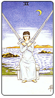 画一个女人坐在一张石凳上,蒙着双眼,双手交叉于胸前,手中握着两把剑。在她背后的海洋将她和陆地分开,而此时正是夜晚。这张牌中唯一强烈的颜色是月亮和鞋子的黄色。这两把剑交叉与她胸前,是为了要保护她远离痛苦的感情,身上的衣服和石凳一样,是灰色的,暗示着感情渐趋冷漠,因为他拒绝面对另它痛苦的因素。假如你不让任何东西接近你,就没有任何东西能伤害你了。她的眼罩是自己绑上去的,因为她的双手是自由的,如果她决定要将它拿掉的话,自然办得到。