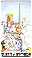 悬挂在她左手腕处的坠饰是在暗示,她必须利用她的剑(心智)来砍断束缚。她对生命的理解已经还给她自由了。她身旁有许多云围绕着,不过她的头却位于云的上端,暗示她能够超越生命中情感的起伏不定。她的手向前方的生命召唤,而剑随时在握,以分析因应之道。皇后的这把剑笔直朝上,露出两段刀口,因为她知道人生的二元性。