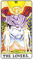 阳光普照,有个天使出现在一对男女的上方。他们两个人裸身站在两棵树之前。女人身后是一棵知识树,而男人背后则是生命树。恋人牌是有关选择的牌,为了找寻满足,男人往向女人,而女人则望向精神或内心。
