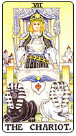 一名武士站在战车上,右手拿着一根绳子或权杖,肩膀上则有两枚蓝色的月亮。战车的蓬盖上缀满了星星,而腰带上则展示着黄道十二宫的各种符号。战车部分停在水中,部分停在陆地。武士的前方有两尊狮身人面兽,一黑一白,正好与女教皇牌上的柱子相呼应。